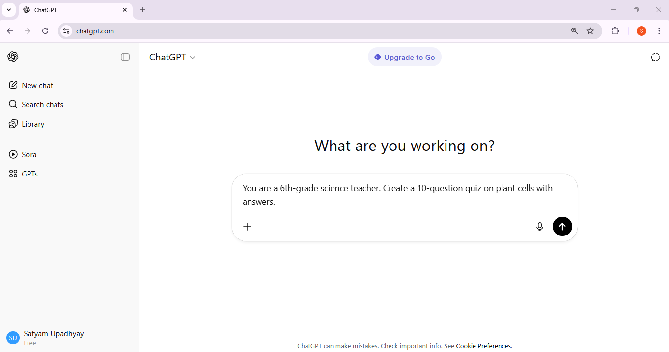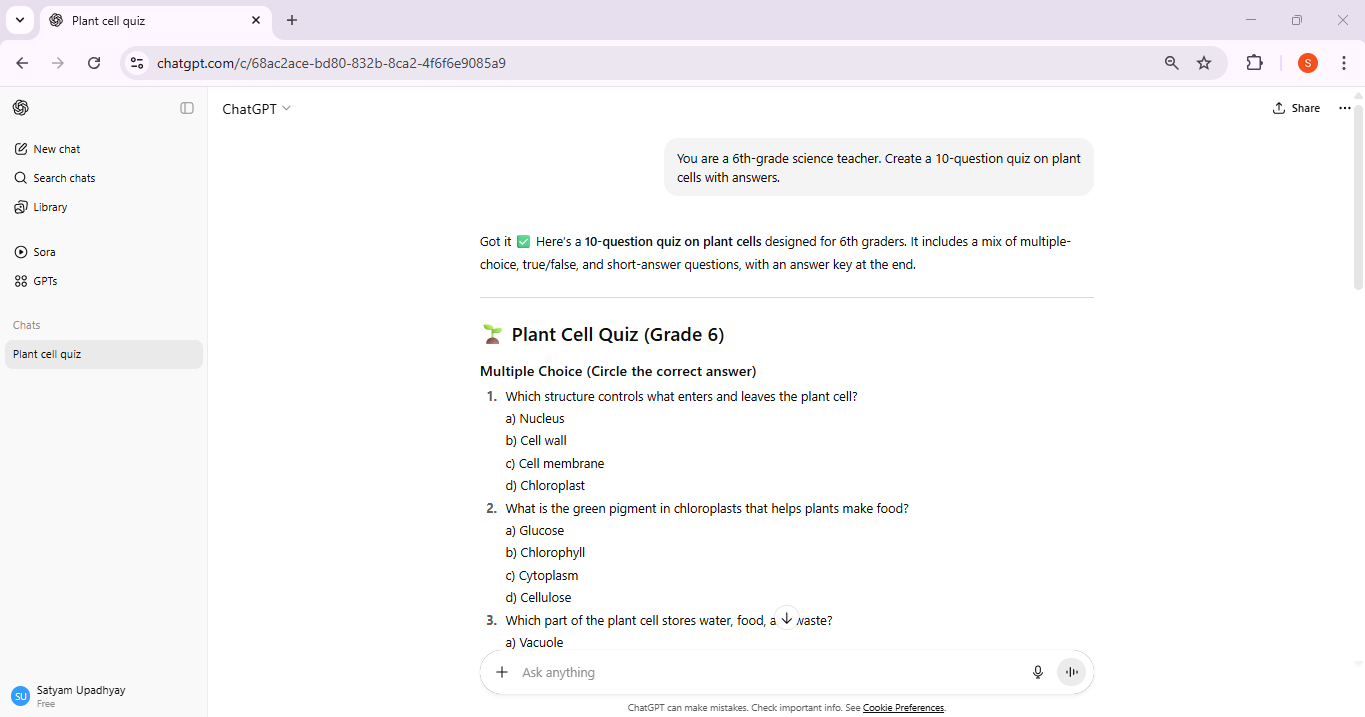 Example starter: "You are a 6th-grade science teacher. Create a 10-question quiz on plant cells with answers".