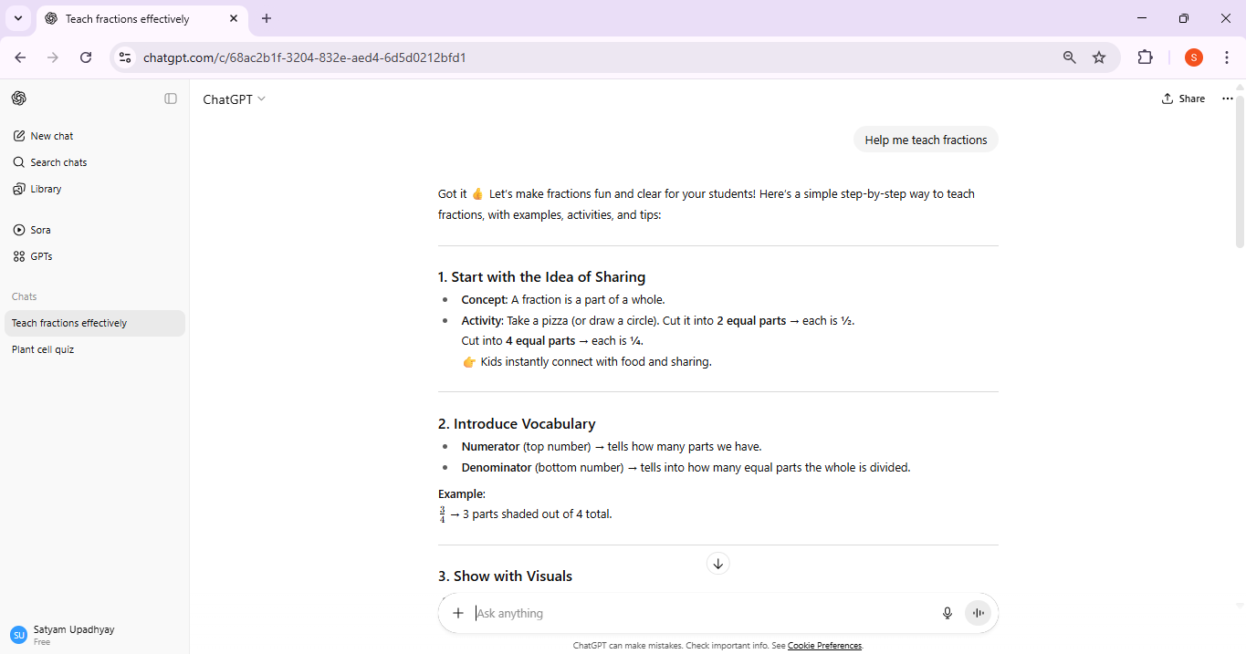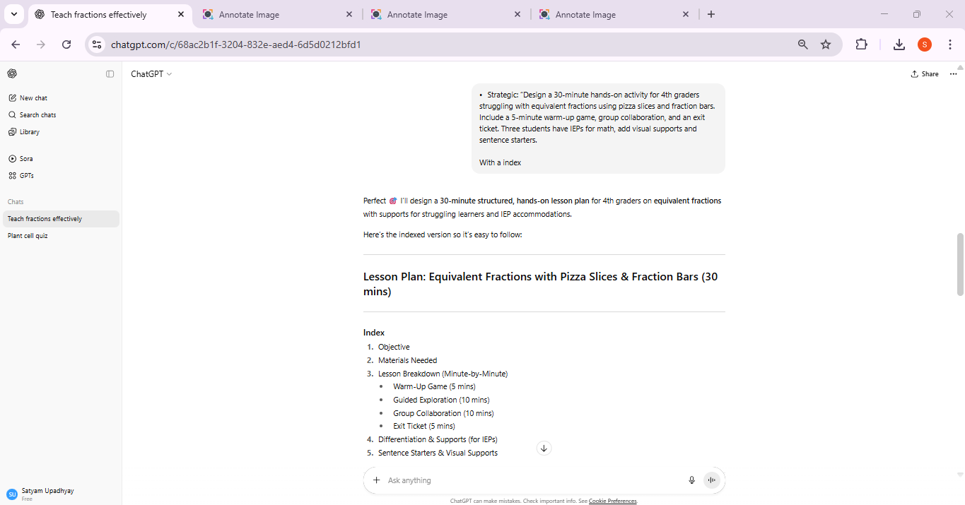 - Strategic: "Design a 30-minute hands-on activity for 4th graders struggling with equivalent fractions using pizza slices and fraction bars. Include a 5-minute warm-up game, group collaboration, and an exit ticket. Three students have IEPs for math, add visual supports and sentence starters".